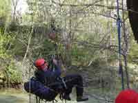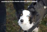 Dvaput tijekom toga dana morali smo pokazati i sposobnost alpinističkih tehnika: jednom pri prelasku preko potoka gdje smo se spuštali u slobodnom padu sa strmine do druge strane i jednom prelazeći rijeku. Oba puta organizator je uz pomoć Gorske spasilačke službe u Ljubljani osigurao žičaru pomoću užadi. Spasilačka služba ovo je izvela savršeno bez ikakve opasnosti po timove i iako smo dobili trnce pri pogledu na rijeku koju moramo prijeći viseći u pojasu svatko sa svojim psom, osjećali smo se zaista sigurno i izvojevali još jednu malu pobjedu nad samima sobom. Na naše zadovoljstvo, psi su oba prijelaza vrlo dobro podnijeli pokazavši dobru socijalizaciju na visinu. Božena je prva od nas hrabro prešla rijeku i dodatno nas vukla pomažući nam prijelaz. |